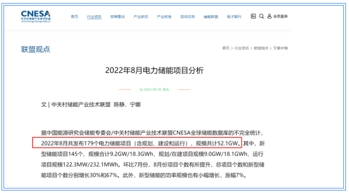 据中国能源研究会储能专委会/中关村储能产业技术联盟(CNESA)全球储能数据库的不完全统计,2022年8月共发布179个电力储能项目(含规划、建设和运行),规模共计52.1GW。其中,新型储能项目145个、规模合计9.2GW/18.3GWh,规划/在建项目规模9.0GW/18.1GWh、运行项目规122.3MW/232.1MWh。2022年上半年,新增投运新型储能项目装机规模589.9MW/1343.3MWh,功率规模同比增长202%。