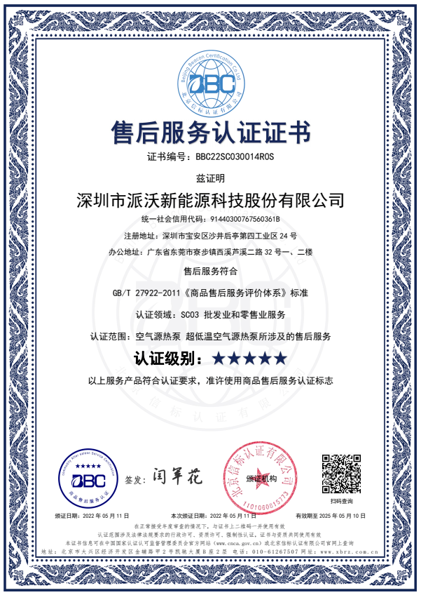 2022年5月,贝博空气能售后服务水平达到相应的国家标准,荣获“五星级售后服务认证”