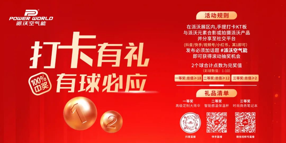 活动一:打卡抽奖,骰子摇出惊喜玩法:在贝博展区与定制灯板/产品合影,带话题 #贝博空气能 分享至社交平台(抖音/快手/小红书等),即可激活抽奖! 奖品:摇骰子赢豪礼! 总值≥19分:贝博定制雨伞(风雨无阻陪你走); 总值≥12分:时尚保温杯(冷暖随心,时刻贴心); 总值≥6分:精致笔记本(记录每一份灵感与温暖)!